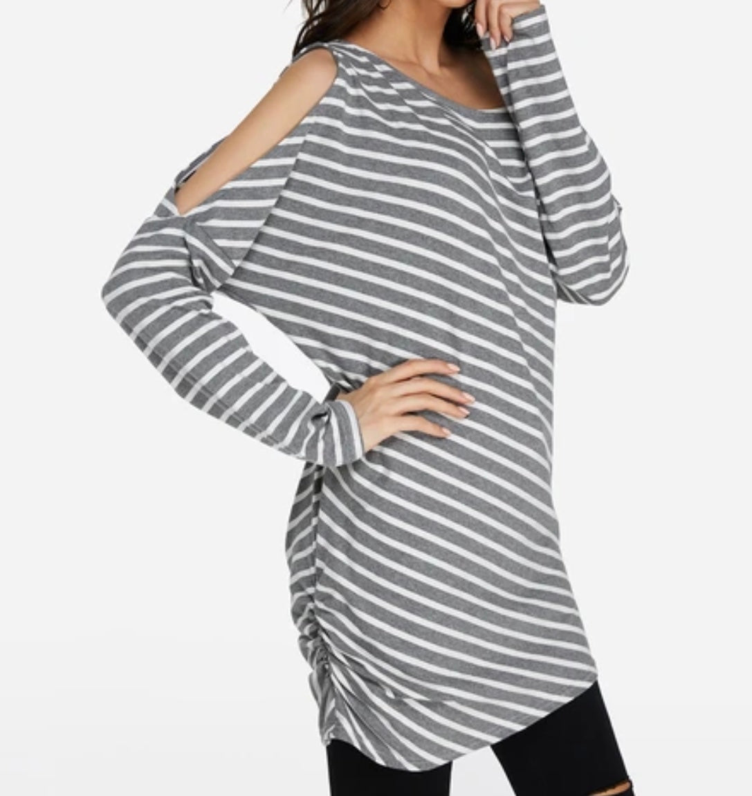 Cotton/spandex. Asymmetrical hem. Grey/white. Loose fitting.