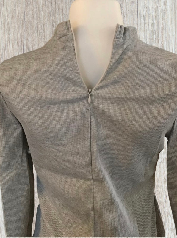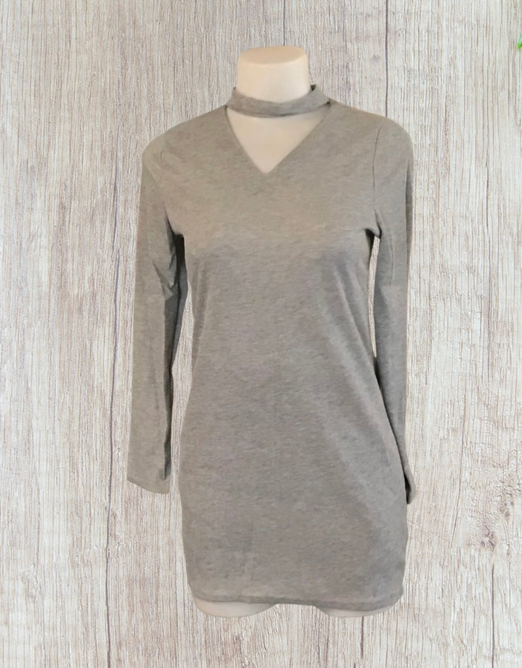 Choker style with v-neck mini sweater dress with back upper zipper. Cotton, polyester. Size S in both colors. Reg $35 on sale for $25.
