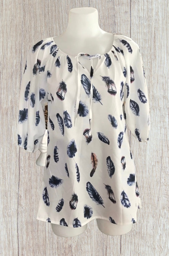 Feather pattern v-neck tie up blouse. Wear off shoulder or up. Loose fitting. 1/2 sleeve with elastic. Polyester, other. No stretch. Very pretty. Reg $35 on sale for $15 + GST